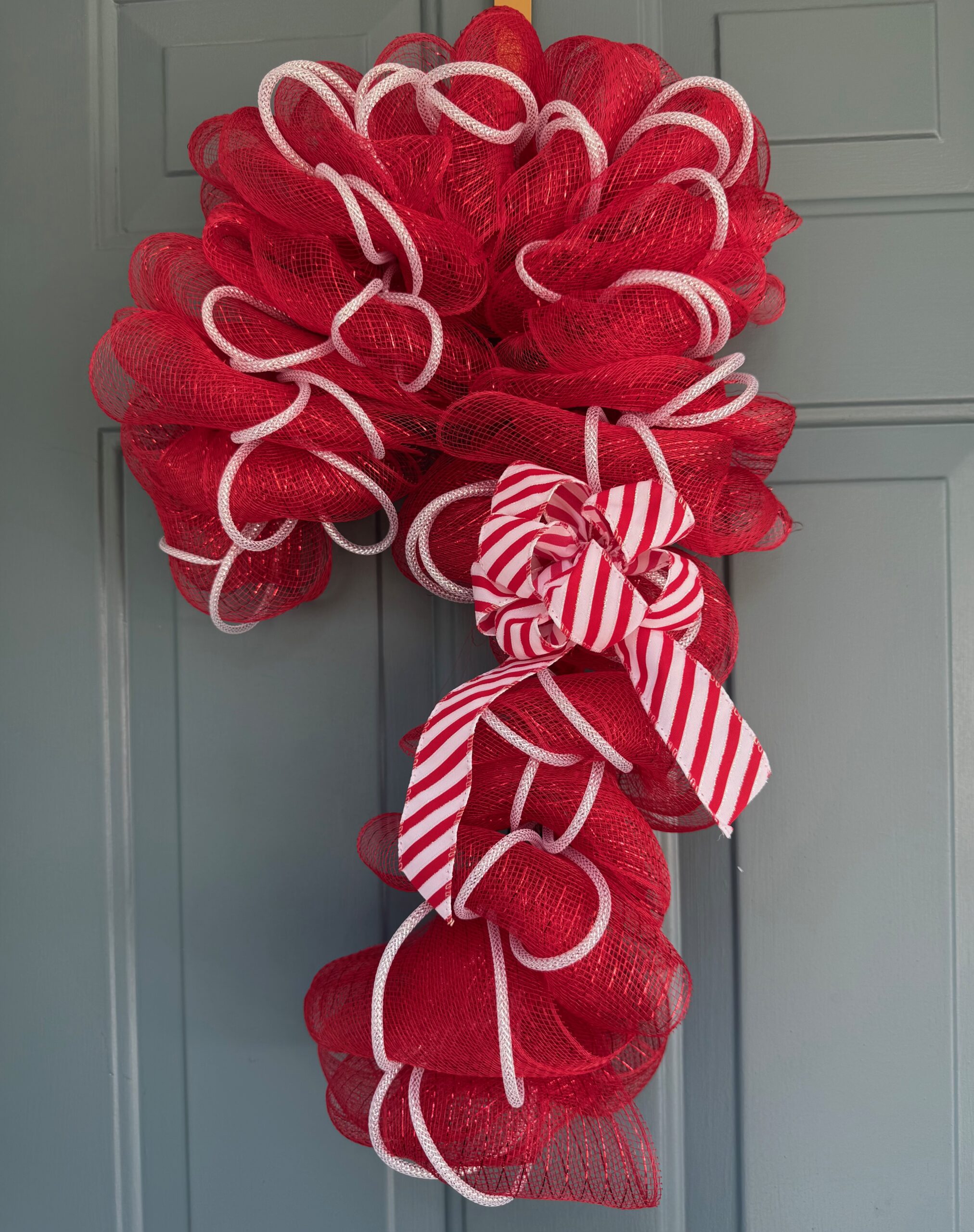 Add a touch of whimsical holiday charm to your home with this handmade 18-inch deco mesh wreath! Shaped like a classic candy cane, this festive wreath is crafted with full, vibrant red deco mesh. It’s elegantly “striped” with twisting strands of bright white deco tubing, giving it a sweet, realistic look. The candy cane is finished with a stunning, large bow tied from candy cane-striped ribbon. It’s the perfect statement piece to welcome guests during the most wonderful time of the year.