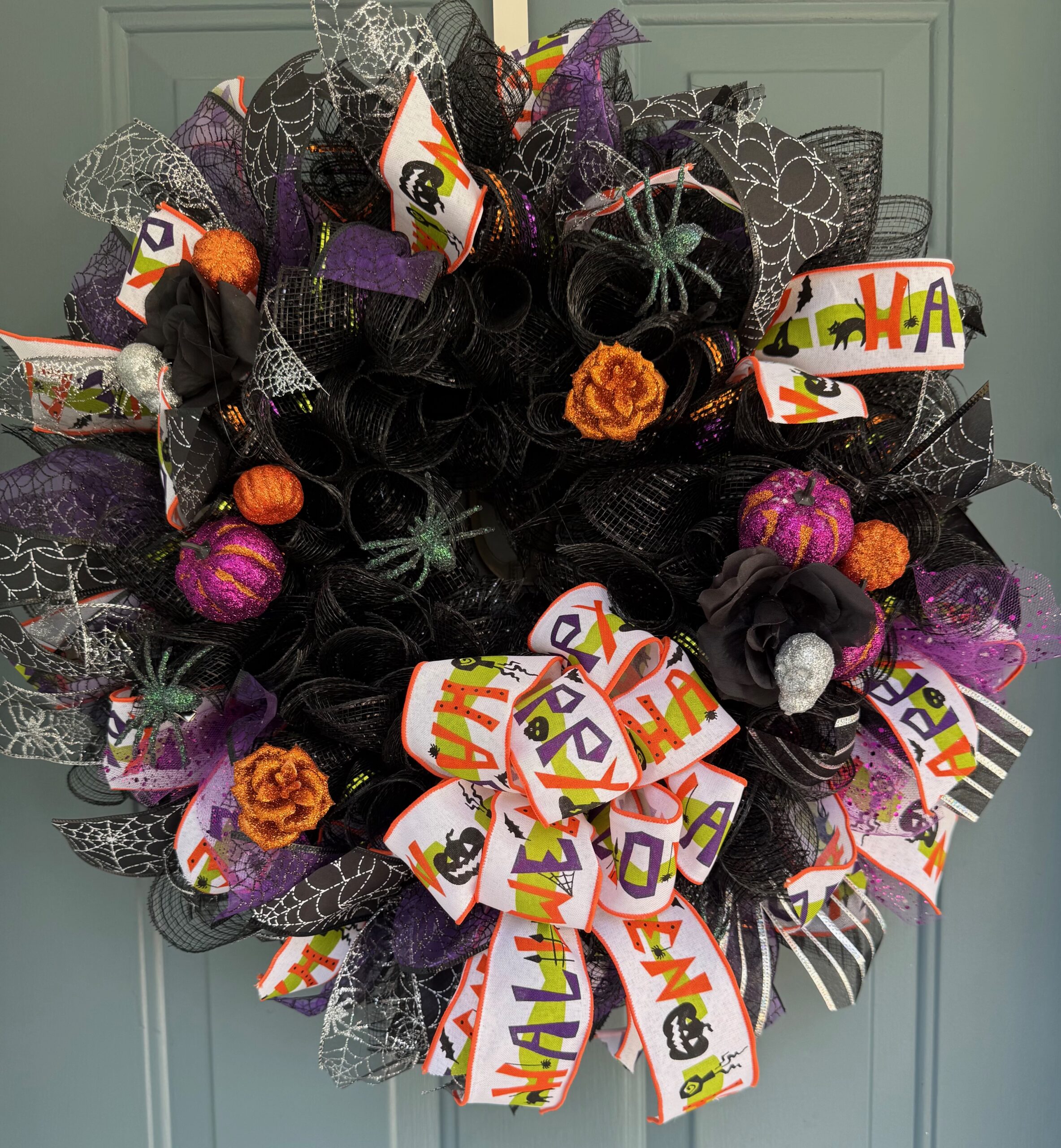Cast a spell of spooky charm on your front door with this handcrafted 18-inch Halloween wreath! It features a full and vibrant black deco mesh base, reminiscent of a mysterious, haunted night. The wreath is beautifully accented with an array of Halloween-themed ribbons in orange, black, and purple, some with glittery patterns. Placed throughout are grinning pumpkins and creepy, multi-colored spiders that give this wreath just the right amount of spooky fun. Hang it up to create a wickedly chic display that will delight all your Halloween visitors.